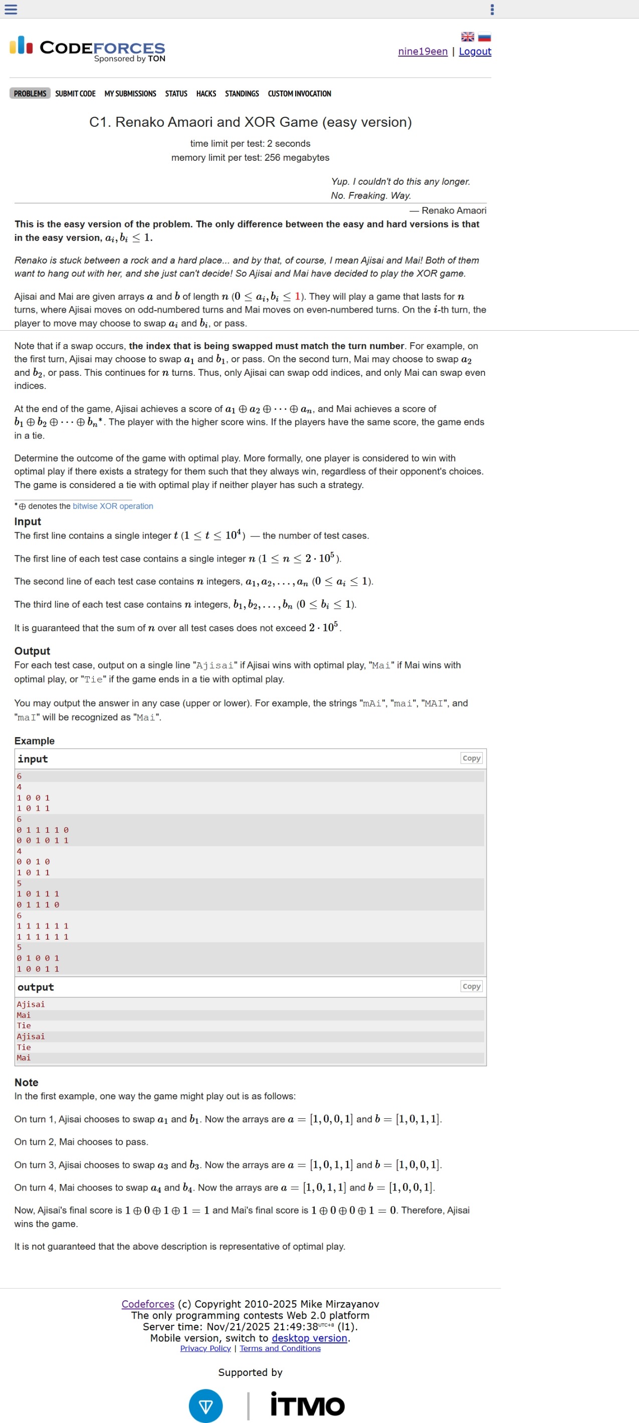在 C1 中,所有元素都是 0/1,若整体异或 T = 1,说明最终两人的分数一高一低,而大小关系由“最后一个能翻转该位的下标”决定。