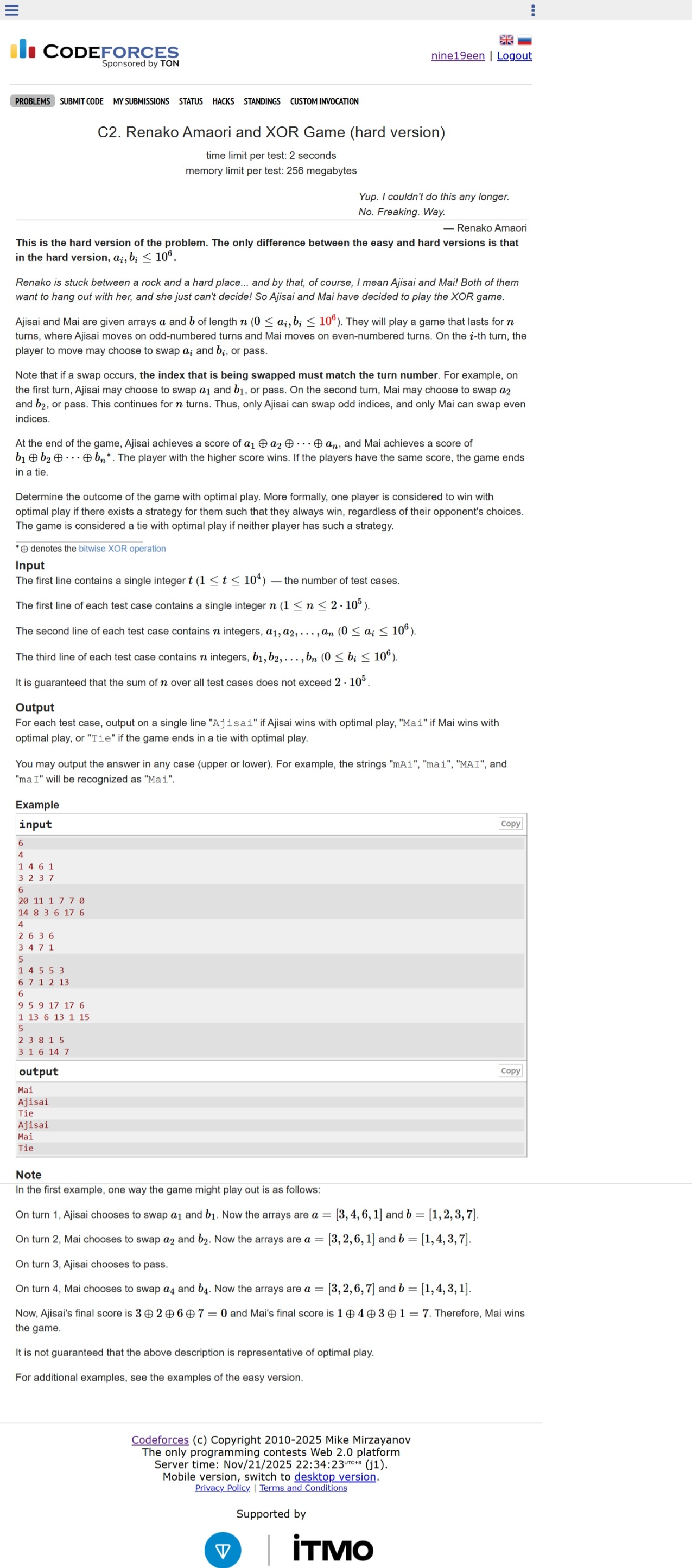 Ajisai_score = a[1] ⊕ ... ⊕ a[n]Mai_score = b[1] ⊕ ... ⊕ b[n]